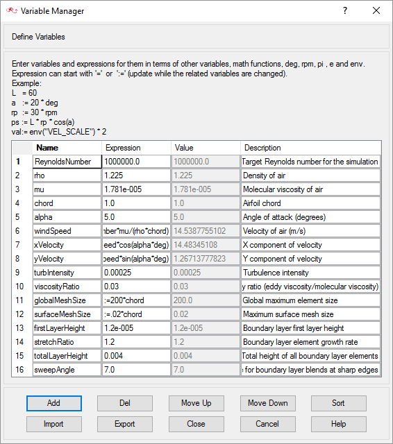 Because this database was set up using variables and expressions, it is easy to re-run the simulation again using a different angle of attack. To accomplish this, open the Variable Manager, and set “alpha” to 0.0. Because the xVelocity and yVelocity variables that were defined for the initial and boundary conditions are a function of this parameter, the database will automatically be updated to reflect the new settings. You can simply write the input again and run the solver to obtain a different angle of attack solution.