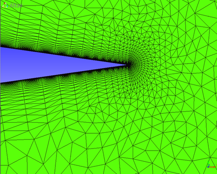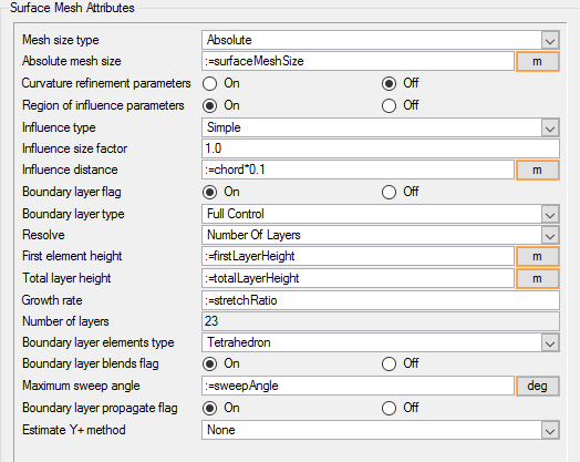 The surface mesh size on the airfoil is controlled through a combination of the mesh size set on the perimeter edges of the airfoil and the mesh size applied directly to the surface. In this tutorial you will also use the region of influence option of the surface mesh to create a refined mesh at a specified distance from the airfoil surface.