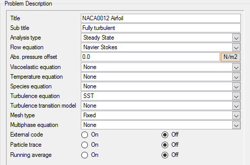 The initial simulation of this airfoil will be considered fully turbulent and use the SST turbulence model. These simulation conditions correspond to a scenario where the boundary layer on the leading edge of the airfoil is tripped with some type of roughness elements to produce a fully turbulent boundary layer over the length of the airfoil.