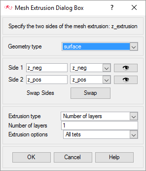 The present simulation is equivalent to a representation of a 2D cross section of the model. In AcuSolve 2D models are simulated by having just one element across the faces of the cross section. Thus when these faces are set up with a similar boundary condition, it coerces the corresponding nodes across the faces to have same results. In this problem, these faces are the negative and positive z-surfaces. This kind of mesh is achieved in AcuSolve with mesh extrusion process. In the following steps you will define the process of extrusion of the mesh between these surfaces.