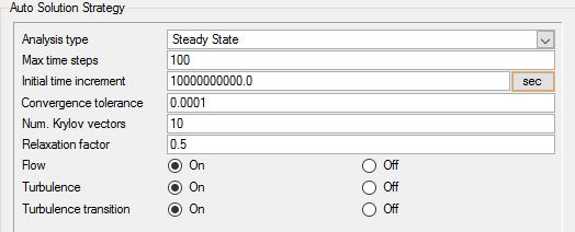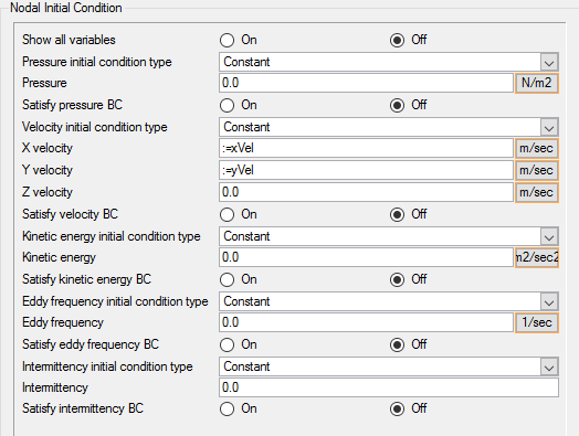 For the SST turbulence model, you need to provide the initial value for kinetic energy and eddy frequency. For the Gamma transition model, you need to provide the initial value for Intermittency, or . If you have a reasonable estimate of these values, you can enter them directly in the nodal initial condition fields. One option is to use the same values that are assigned at the inlet boundary. In the absence of good estimates for the initial conditions, it is also possible to let AcuSolve perform an automatic initialization of the turbulence and transition variables. By setting these values to zero, AcuSolve will trigger an automatic initialization of these variables.