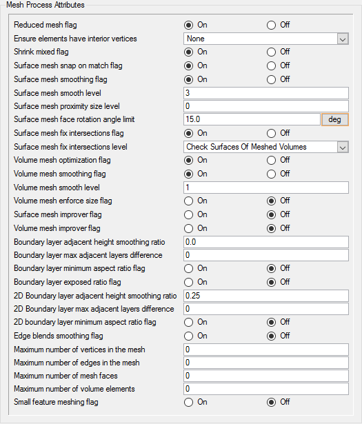 Setting local mesh attributes, such as surface mesh attributes, is not mandatory. When a local mesh attribute is not found for a component, the global attributes are used as the mesh generation control for that component. If a local mesh attribute is present, it will take precedence over the global setting.