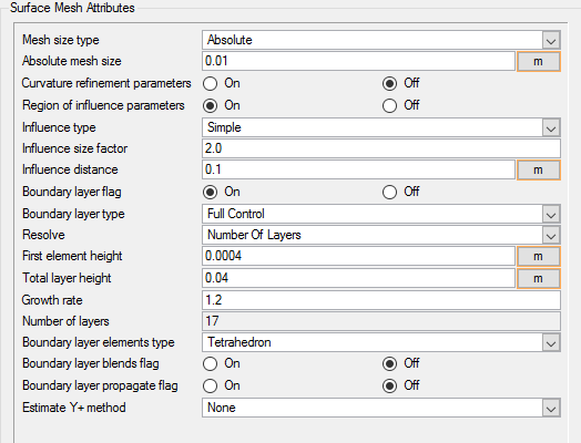 - The first layer height of the boundary layer mesh should be y+ < 5