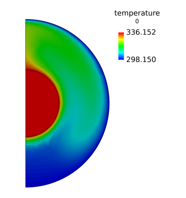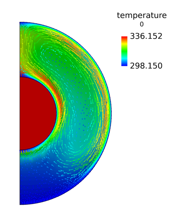 The system being simulated contains an internally-heated cylinder, which is surrounded by a cylindrical ring of a larger diameter. The annular volume between the two cylinders is filled with a fluid (air). The inner cylinder thus acts a heat source, and the fluid in contact with the surface of this heat source is heated up. This hot fluid, being lower in density than the cold fluid, then rises up to the upper part of the annulus due to buoyancy effects, and displaces the cold fluid at top. At the same time, the film of fluid which was in contact with the heating surface is replaced by the surrounding cold fluid. This new film of cold fluid goes through the same process until eventually a steady state convection current is achieved, or the inner cylinder ceases to generate heat and slowly the whole system achieves an equal temperature.