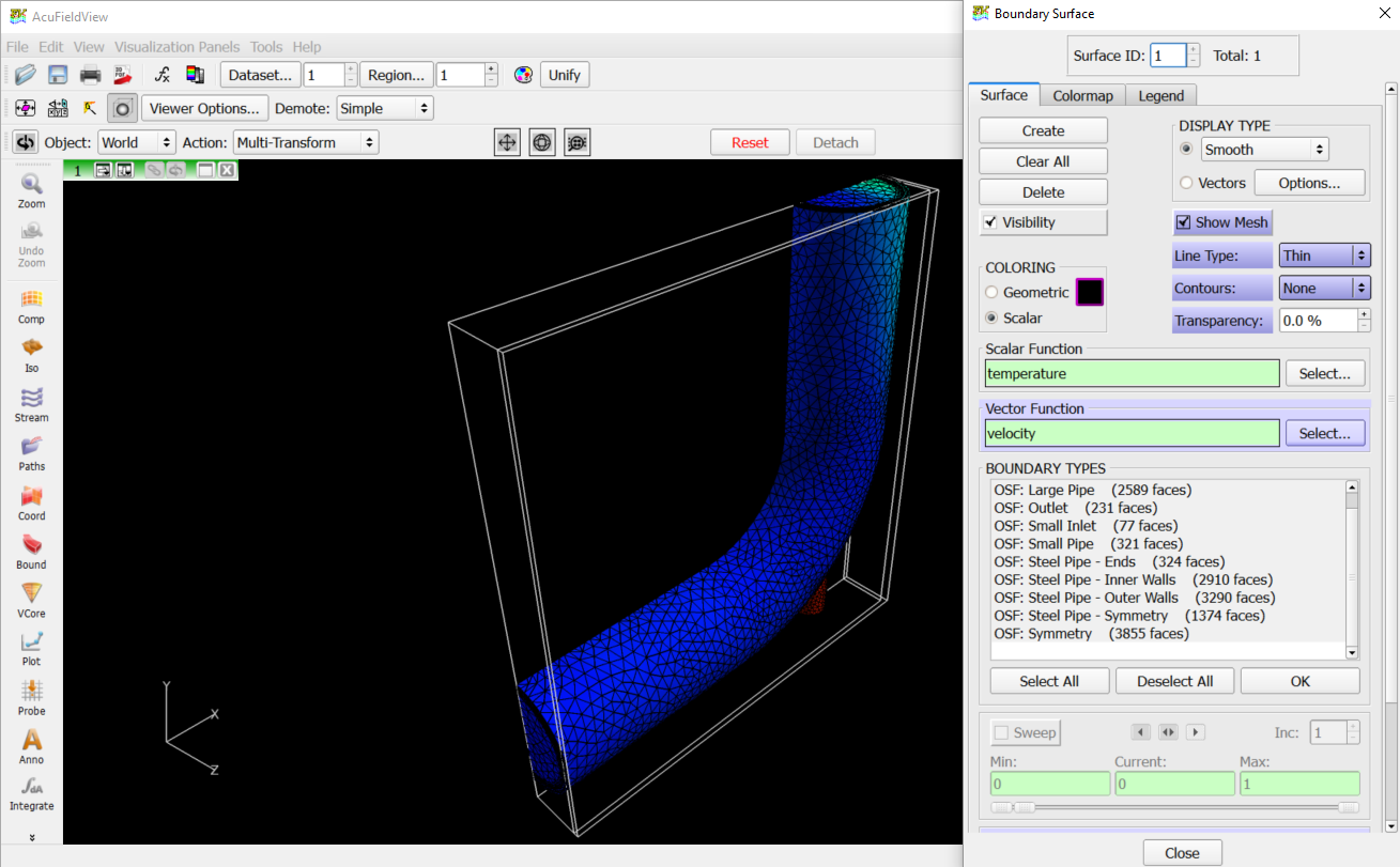 When AcuFieldView is started directly from AcuConsole, the model will be displayed in an isometric view with a Boundary Surface dialog open. The initial view is shown in perspective, with an outline around the model. You will manipulate the view in the next steps, and in later steps will view different flow characteristics using the Boundary Surface dialog.