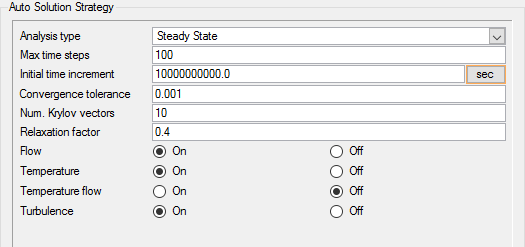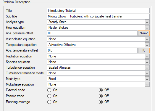 The general parameters that you will set for this tutorial are for turbulent flow, steady state time analysis and for thermal analysis using advection-diffusion equations.