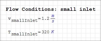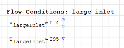 Based on mass conservation, the combined flow rate (Q) yields a velocity of 0.475 m/s downstream of the small inlet. This value is useful in determining the Reynolds number, which in turn can be used to determine if the flow should be modeled as turbulent, or if it should be modeled as laminar.