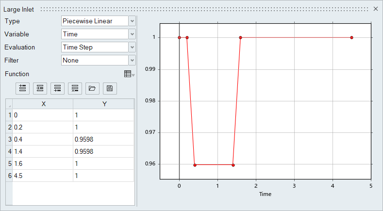 The temperature change at the large inlet is from 295 K to 283.15 K. At the small inlet, the temperature changes from 320 K to 283.15 K. The ratio of the cold slug temperature to the initial temperature of the large inlet flow is 0.9598. The ratio of the cold slug temperature to the initial temperature of the small inlet flow is 0.8848. These values will be used in creating multiplier functions to model the transient temperatures at the inlets.