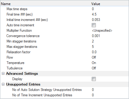 At 0.2s into the simulation, a cold slug of water is injected at both the inlets and the temperature is ramped down to 283.15 K starting from 0.2 s to 0.4 s. Then it is maintained constant at 283.15 K for 1 sec and then ramped up to initial states from 1.4s to 1.6s. Given a flow path of 0.6356 m, the transit time for the slug is approximately 1.6s. Therefore, our simulation time should be at least 3.2 s to factor in the duration of the slug and transit time. The total simulation time will be 4.5s to allow time for the thermal conditions to return to a steady state.