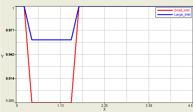 The temperature change at the large inlet is from 295 K to 283.15 K. At the small inlet, the temperature changes from 320 K to 283.15 K. The ratio of the cold slug temperature to the initial temperature of the large inlet flow is 0.9598. The ratio of the cold slug temperature to the initial temperature of the small inlet flow is 0.8848. These values will be used in creating multiplier functions to model the transient temperatures at the inlets.