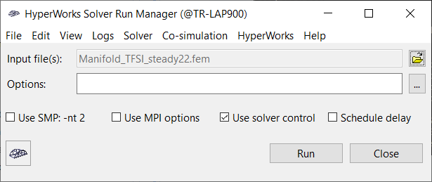 Now that the AcuSolve solution has been calculated, you are ready to use the utility ‘acuOptiStruct’ to generate the OptiStruct input deck and run the case using HyperWorks Solver Run Manager. HyperWorks Solver Run Manager is a simple utility which allows to launch any HW solver by selecting appropriate input file(s) and typing any options (if needed) in the field displayed. OptiStruct is an industry proven, modern structural analysis solver for linear and nonlinear structural problems under static and dynamic loadings. OptiStruct can be started directly from the Start menu.