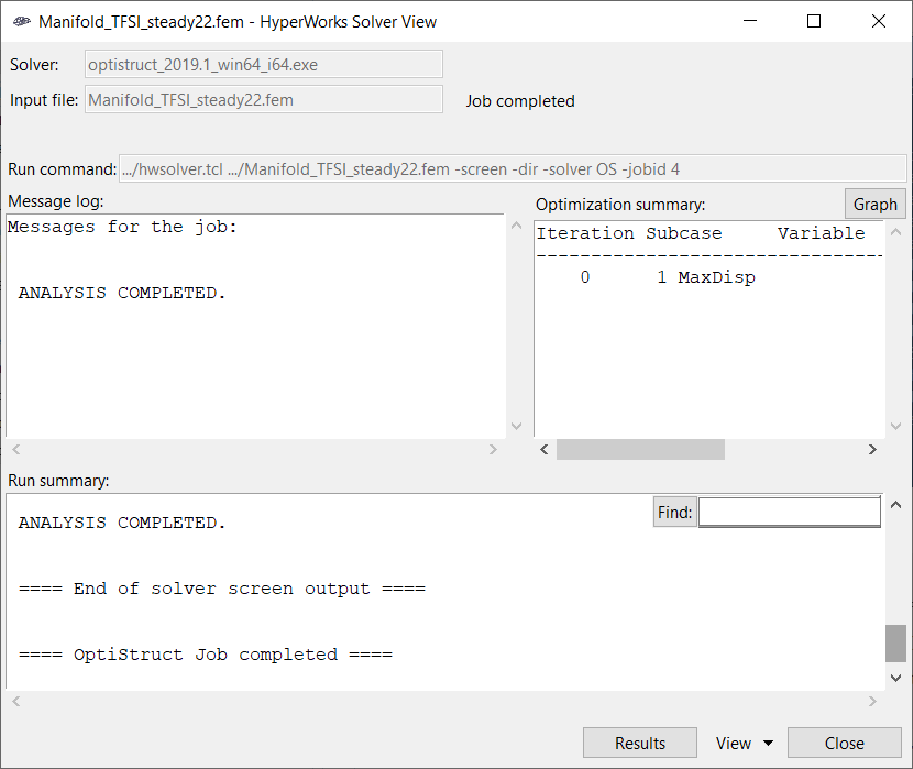 Once the OptiStruct run is complete, close the HyperWorks Solver View dialog. In the HyperMesh Desktop window, close the AcuSolve Control and Solver job Launcher dialogs. In the next few steps, you will plot the contour plot of temperature and pressure on the fluid domain and the displacement and stress contours on the solid domain.