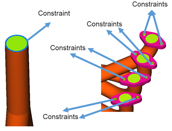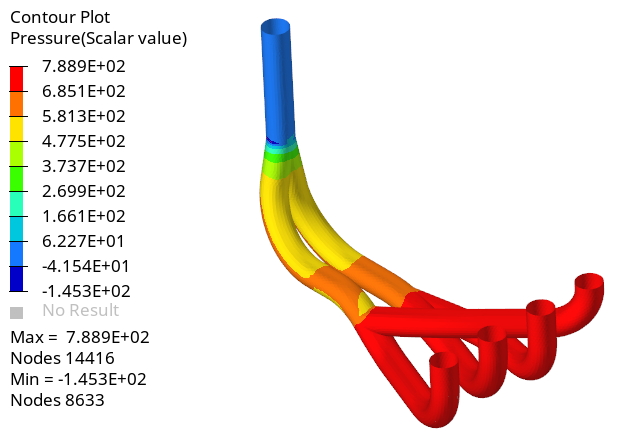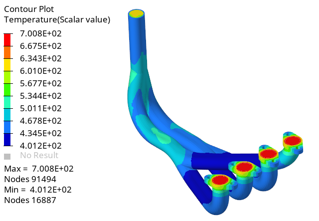 The combustion mixture enters the inlets and heat is transferred through conduction inside the manifold. The heat transfer causes deformations and stress in the manifold body which can be simulated using OptiStruct.