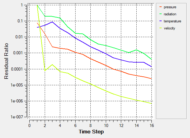 While AcuSolve is running, you can monitor the progress of the solution using AcuProbe and plot the values of residual ratios, solution ratios, and variables like temperature, heat flux, etc. Once the solver run has started, the AcuTail and AcuProbe windows should be launched automatically.