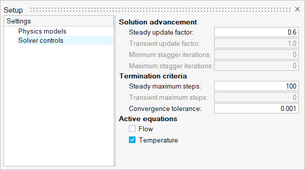 The problem is solved as a steady state case to allow the heat transfer in the solid and fluid regions to reach an equilibrium.