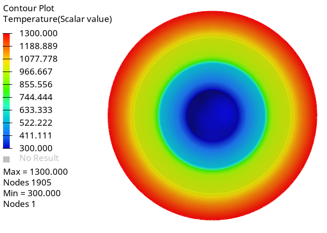 The problem consists of a fluid region with arbitrary material properties between two concentric spheres with surfaces held at fixed temperature, as shown in the following figure, which is not drawn to scale. The radius of the outer sphere is 0.04 m and the radius of the inner sphere is 0.01 m. The inner surface of the inner sphere is defined to have a constant wall temperature at 300.0 K (26.85 ºC). The outer surface of the outer sphere is defined to have a constant wall temperature at 1300.0 K (1026.85 ºC). The fluid within the spheres is defined as a non-conducting material, allowing heat to transfer via radiation only.