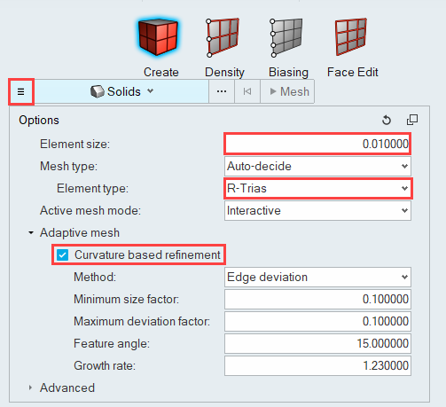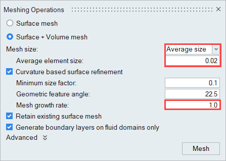 In this step, first you will create a surface mesh using the Interactive meshing tool; then, you will specify a global mesh size and growth rate for the model and generate the volume mesh using the Batch tool in the Mesh ribbon.