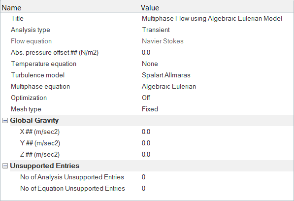 In this step, you will start by setting up the Multiphase material model and body force parameters. Then, you will assign the surface boundary conditions and material properties to the fluid volume.