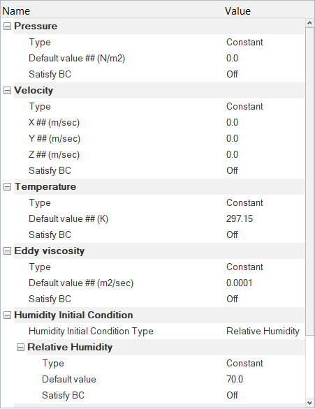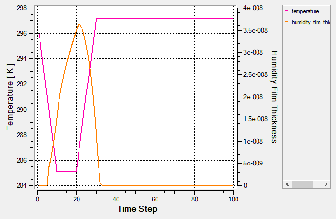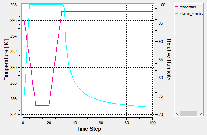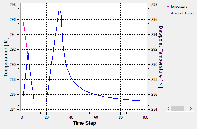 From the above plot, we can see that the Air volume initial temperature is set to 297.15 K. The Bottom Wall temperature drops to 285.13 K over 1 sec, maintains 285.13 K for 1 sec, and then rises back to 297.15 K over 1 sec. The dew point temperature of the air at 70% RH is 291.14 K and is reached at 0.5 and 2.5 sec. On the whole we can see that both condensation and evaporation occurs when the dew point temperature is reached, as explained above.