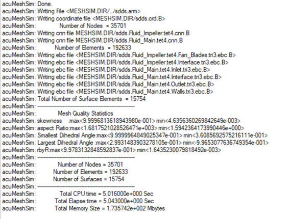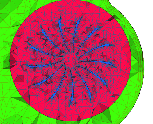 In addition to setting appropriate conditions for the simulation, it is important to generate a mesh that will be sufficiently refined to provide good results. For this problem the global mesh size is set to provide approximately 16 elements around the circumference of the inlet which results in a mesh size of 0.02 m. Note that higher mesh densities are required where velocity, pressure and eddy viscosity gradients are larger. In this application, the flow will accelerate as it passes through radial flow paths between the fan blades. This leads to the higher gradients that need finer mesh resolution. Proper boundary layer parameters need to be set to keep the y+ near the wall surface to a reasonable level. The mesh density used in this tutorial is coarse and is intended to illustrate the process of setting up the model and to retain a reasonable run time. A significantly higher mesh density is needed to achieve a grid converged solution.