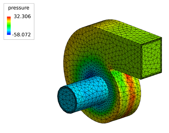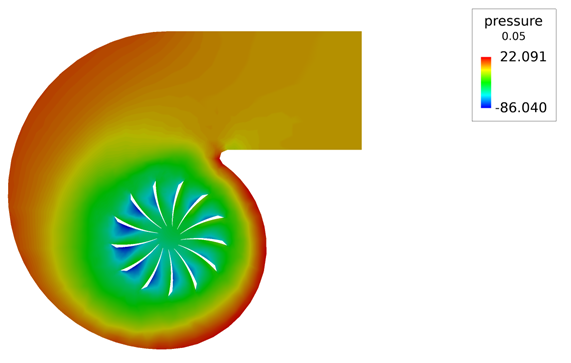 In this tutorial, you worked through a basic workflow to set up a steady state simulation with a rotating reference frame in a centrifugal blower. Once the case was set up, you generated a mesh and generated a solution using AcuSolve. AcuProbe was used to post-process the pressure rise in the blower. Results were also post-processed in AcuFieldView to allow you to create contour views for the pressure along the walls and on the mid coordinate surface of the blower. New features introduced in this tutorial include creating a rotating reference frame and creating a user function in AcuProbe.