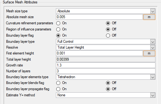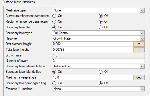 In the following steps you will set meshing attributes that will allow for localized control of the mesh size near the walls. The mesh size on the wall will be inherited from the global mesh size that was defined earlier. The settings that follow will only control the growth of the boundary layer from the walls.