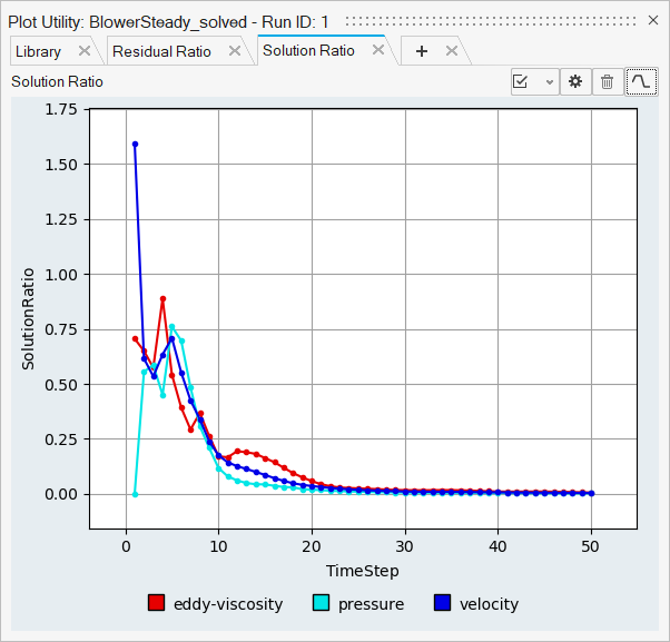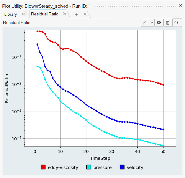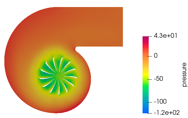 In this tutorial, you successfully learned how to set up a steady state simulation involving a rotating reference frame in a centrifugal blower. You started by importing the mesh and then once the case was set up, you generated a solution using AcuSolve. Then, you computed the blower momentum using the Plot Utility and created a contour plot for pressure and velocity streamlines using HW-CFD post.