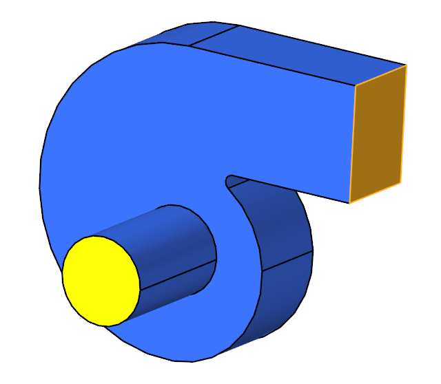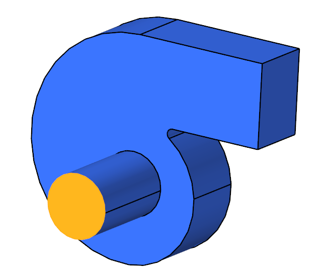 The problem to be addressed in this tutorial is shown schematically in Figure 1 and Figure 2. It consists of a centrifugal blower with a wheel of forward curved blades, and a housing with inlet and outlet ducts. The fluid through the inlet plane enters the hub of the blade wheel, radially accelerates due to centrifugal force as it flows over the blades, and then exits the blower housing through the outlet plane. Because they're relatively cheaper and simpler than axial fans, centrifugal blowers have been widely used in HVAC (heating, ventilating, and air conditioning) systems of buildings.