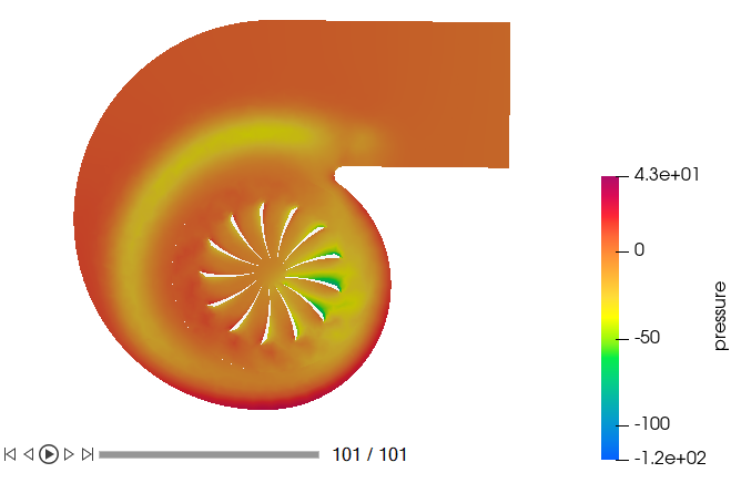 In this tutorial, you worked through a basic workflow to set up a transient simulation with a sliding mesh in a centrifugal blower. You started by importing the mesh; once the case was set up, you generated a solution using AcuSolve. Then, you computed the blower momentum using the Plot Utility and created a contour plot for pressure on a cut plane using HW-CFD post.