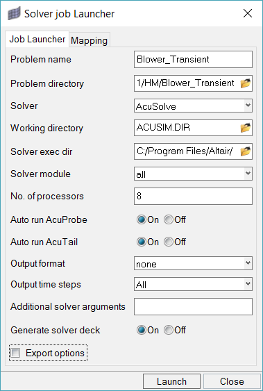 Prior to running through this tutorial, copy HyperMesh_tutorial_inputs.zip from <Altair_installation_directory>\hwcfdsolvers\acusolve\win64\model_files\tutorials\AcuSolve to a local directory. Extract ACU-T5001_BlowerTransient.hm from HyperMesh_tutorial_inputs.zip.