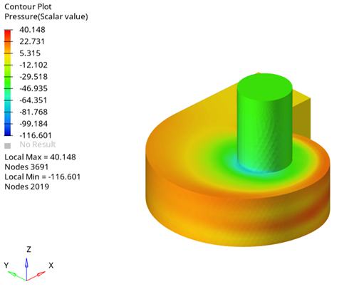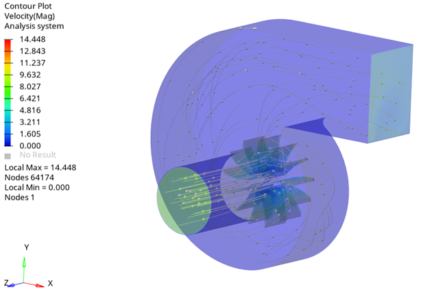 In this tutorial, you successfully learned how to set up and solve a transient simulation of a centrifugal air blower using the sliding mesh approach. You started by importing the meshed geometry and then ran the steady state simulation. Then, you used the steady state result as the starting point for the transient simulation using the AcuProj tool to specify the nodal initial conditions and then solved the transient simulation using the sliding mesh approach instead of the moving reference frame approach. Once the transient solution was computed, you launched HyperView and created an animation of pressure contours and streamlines.