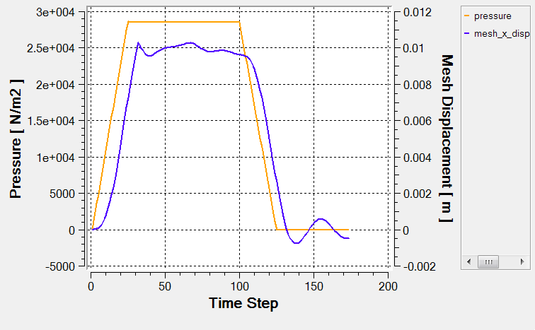 Once a solution is calculated, the flow properties of interest are the displacement of the moving surface, velocity of the moving surface, mass flow rate at the outlet, pressure contours on the symmetry plane and velocity vectors on the symmetry plane.