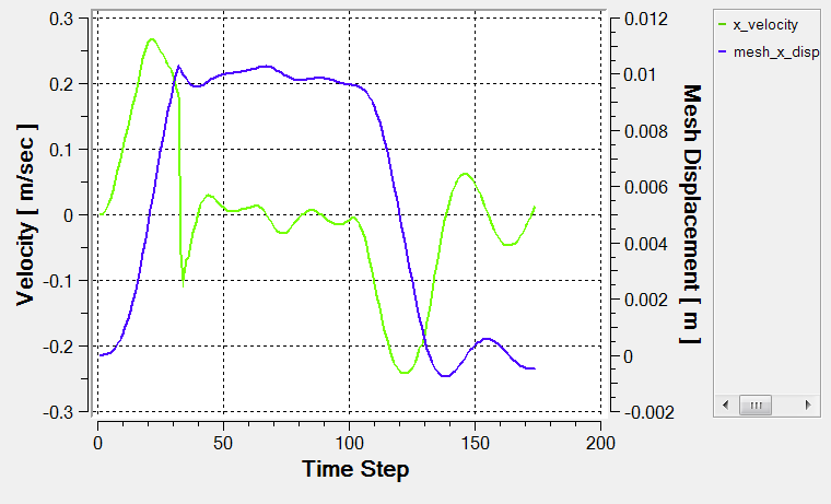 In this tutorial, you worked through a basic workflow to set up a transient simulation for moving mesh and variable inlet pressure. The solution of this case was coupled between AcuSolve for the flow field and MotionSolve for the rigid-body dynamics. Once the case was set up, you generated a mesh and generated a solution using AcuSolve and MotionSolve. AcuProbe was used to post-process the motion of the valve shutter (x_mesh_displacement) and velocity of the valve walls. Results were also post-processed in AcuFieldView to allow you to create contour and vector views, and to allow you to view the transient data. New features introduced in this tutorial include: coupled solution with an external code, fluid-structure interaction, mesh motion, transient simulation, multiplier functions, post-processing with AcuProbe, and animation of transient results.