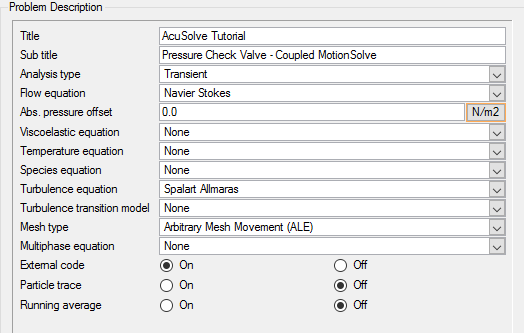 The general attributes that you will set for this tutorial are for turbulent flow, transient time analysis, arbitrary mesh movement, and the use of an external code (MotionSolve).
