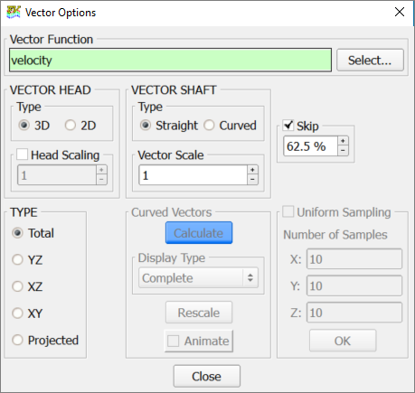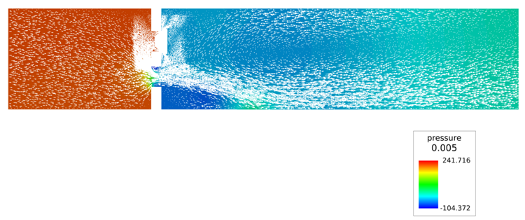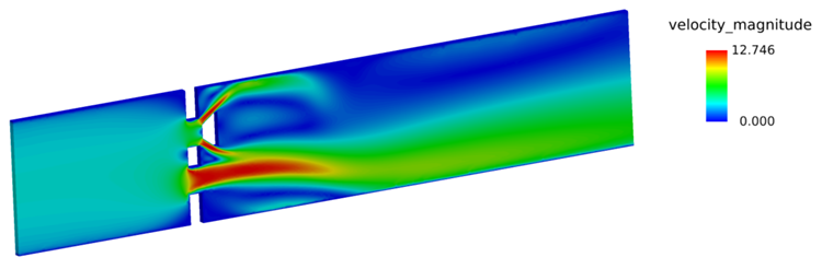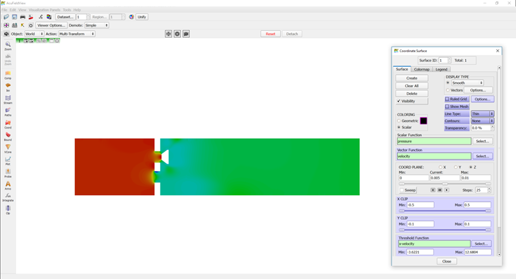In the following steps you will start AcuFieldView, display velocity magnitude and animate the view to show mesh displacement. You will then display velocity vectors and pressure contours when the valve shutter is closed.