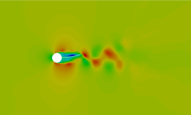The CFD model contains a cantilever beam and a rigid cylindrical body. The beam along with the cylinder is placed in a water flow stream. This cylindrical body acts a bluff body placed in the flow and stimulates vortex shedding in the flow downstream as it passes over the cylinder. The alternating shedding of vortices creates a zone of alternating asymmetric pressure distribution on either side of the beam. Such an alternating pressure distribution exerts an oscillating force on the beam, creating a sustainable oscillating vibration in the beam.