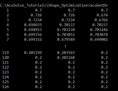 AcuSolve provides two post-processing utilities specific to optimization problems, AcuGetDv and AcuGetRsp. AcuGetDv provides the values of the design variables for all the cases included in the solution. AcuGetRsp provides the values of the response variables for all the cases included in the solution.