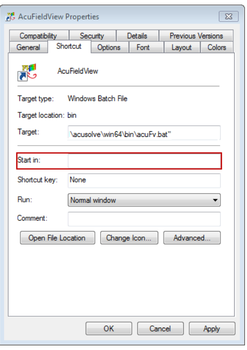 Start in entry. To change that property, browse to the AcuFieldView shortcut on the Start menu, right-click, and