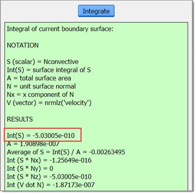 The convective flux out of the artery Int(S) is about -5.03 e-010. Integrating across this