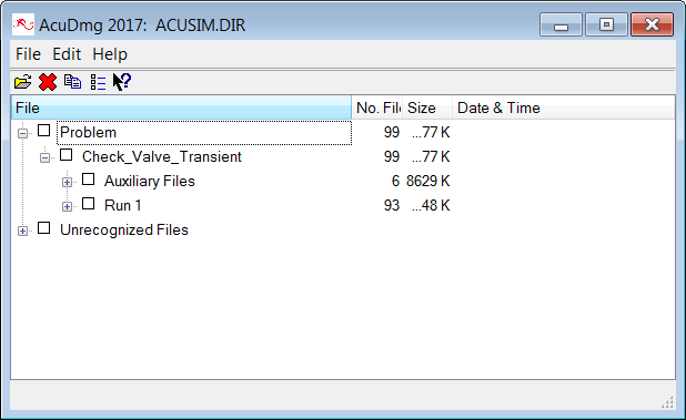 ACUSIM.DIR should not be modified manually by you. Instead, AcuDmg, the file and directory manager with a graphical interface, should be used to selectively delete unneeded files. For information on the files in ACUSIM.DIR, see Files in ACUSIM.DIR.