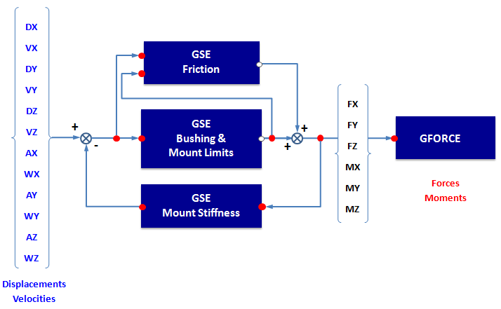 The mount GSE computes the combined local structural deflection and rate-of-change-of-deflection of I-Body and J-Body due to the forces and moments across the bushing. The input to the mount GSE is the sum of the forces and moments due to the bushing, friction, and limits acting between the I-Body and J-Body that the bushing connects.