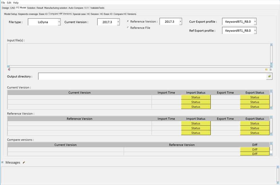 The Compare HM Versions tab allows you to compare input/output solver files between any two HyperMesh versions. You can also compare with a reference file or previously certified file. This is most useful for non-HyperMesh generated solver decks.