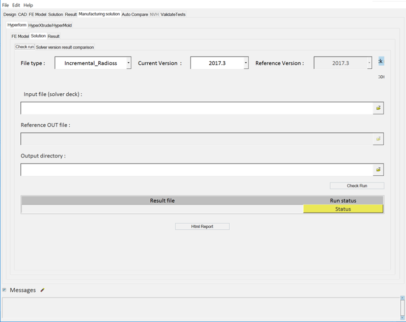 Out Ref. Compare Input file (solver deck) is solved for 0 ms and displays the run status. The .out file generated after the solver check run is compared with the Reference .out file