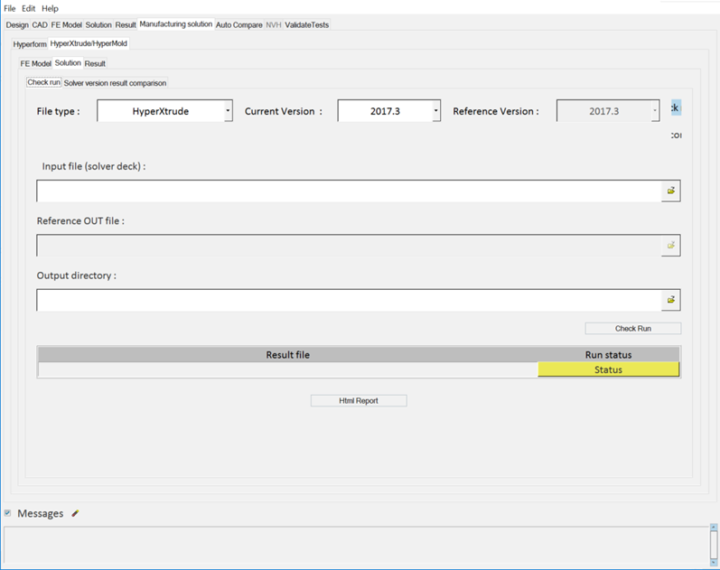 Out Ref. Compare Input file (solver deck) is solved for 0 ms and displays the run status. The .out file generated after the solver check run is compared with the Reference .out file