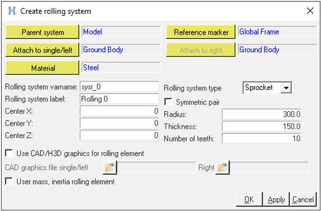 Use this dialog to create sprocket, idler, roller, tensioner, wheel, and pulley rolling systems. You can use the Symmetric pair option to create rolling in a pair symmetric to the x-z plane. Rolling elements are usually built as a combination of primitive geometries glued together. However, you can also add CAD or H3D Graphics to the rolling system instead to increase the fidelity of the model. Mass and inertia for the rolling system are calculated based on the provided geometric dimensions or CAD Graphics. Alternatively, user-defined mass and inertia can be provided instead. The properties of the rolling system can be modified in the dataset under the rolling system after the system has been created.