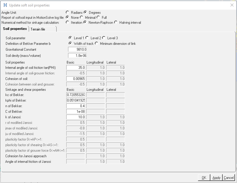 Use this dialog to update the soil properties, which define the interaction between the soil and track link. Entities are enabled or disabled based on the input selections. All inputs are in model units. The default values are in model units and can be modified based on the application. For more information on the soft soil, see Soft-soil Data Input.