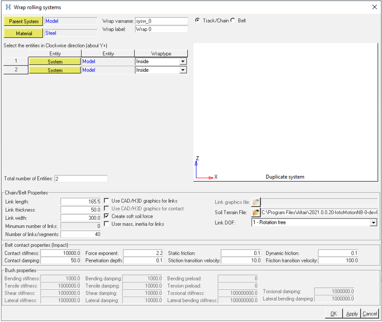 Use this dialog to wrap a track, chain, or belt on a rolling system. You can pick the Track/Chain or Belt option based on the type of wrapping. Track uses sphere-to-sphere contact between the sprocket and track and sphere-to-box contact for other entities and the track. Chain uses sphere-to-sphere contact for the sprocket and chain. The belt uses sphere-to-sphere contact between all entities and the belt. By default, track, chain, and belt are represented by a combination of primitive geometries. If necessary, you can use the CAD or H3D file of all entities for the track, chain, or belt instead. The CAD or H3D file is positioned at the mid-marker and can be repositioned using a dataset.