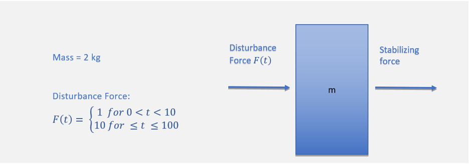 The figure above shows a simple representation of a stabilizer. The stabilizer is basically a PID controller that prevent the mass from deviating from its initial point. The disturbing force is a time variant function.