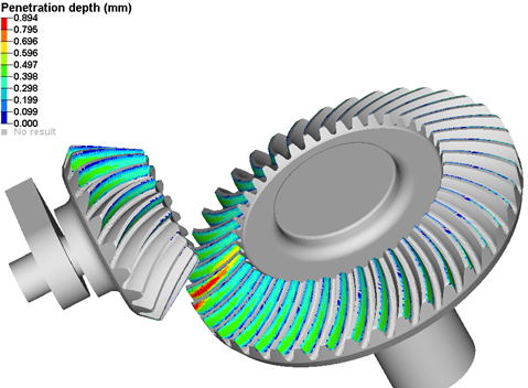 Figure 8. Contact Summary Frame for Bevel Gears in ContactMotionSolve writes an additional load case, called “Contact Overview” to the animation H3D file when the model contains active 3D rigid body contact(s). Within this load case, you can create a contour plot defined by maximum penetration depth.