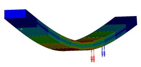 Figure 6. Displacement Vectors for an NLFE Beam Superimposed on the Stress Contour PlotYou may create vector plots of the following data types: displacement, velocity (CMS only), acceleration (CMS only), force (CMS only), and moment (torque, CMS only). The vectors may be resolved in a variety of coordinate systems. Scaling and querying are also supported. The vector plots can also be overlaid over the stress contour plots.